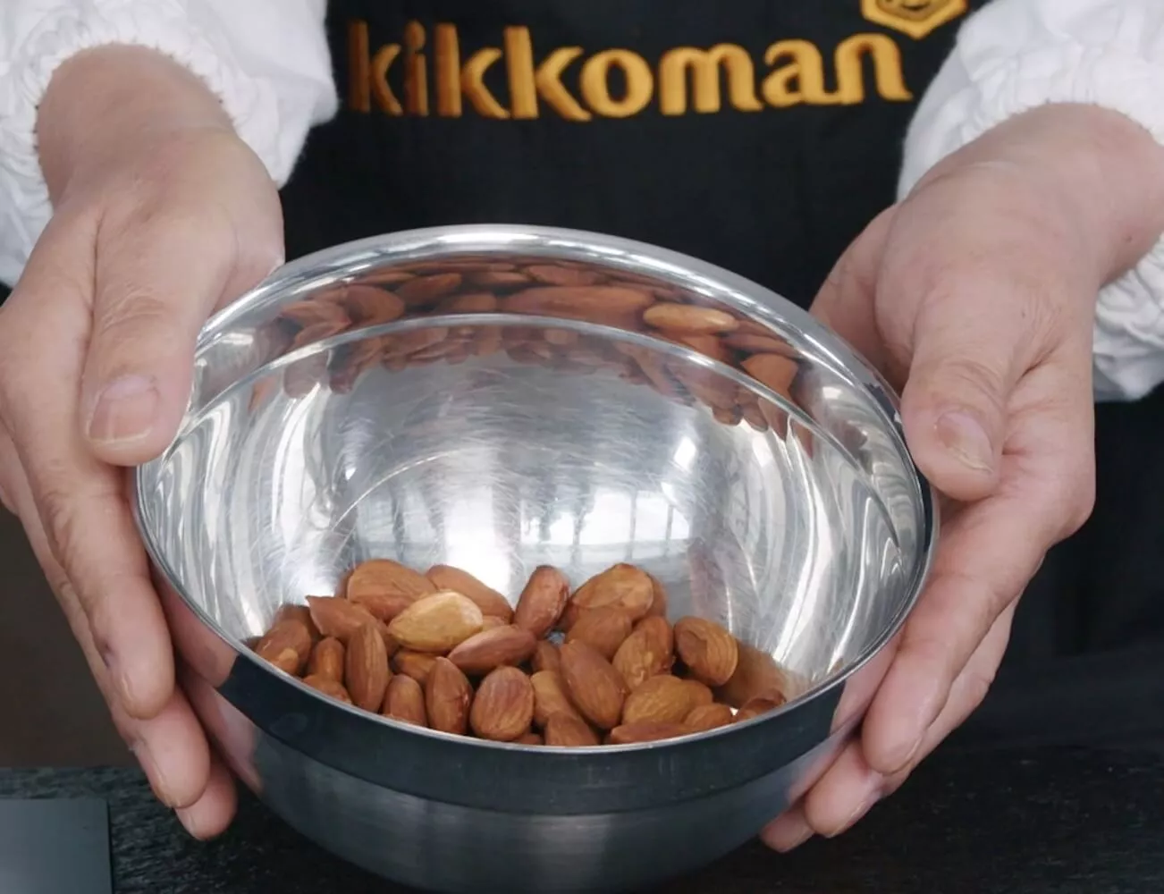 - Horké mandle míchejte 2 minuty s Kikkoman Sójovou omáčkou.