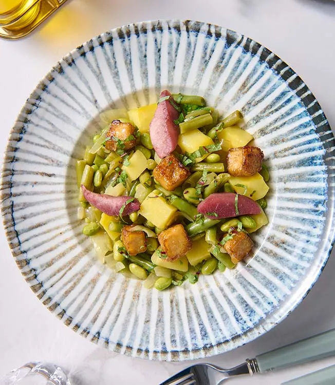 Hruškový salát s vínem, zelenými fazolkami a tofu