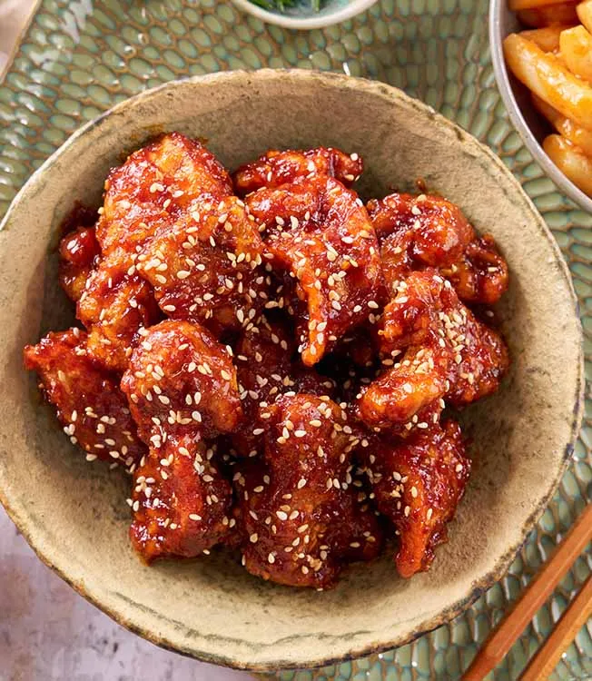 Šťavnaté kuře, dvakrát smažené pro mimořádnou křupavost a obalené ve sladko-pálivé omáčce Kikkoman Kimchi pikantní chili s medem a česnekem – autentické korejské street food v té nejlepší podobě.