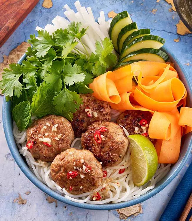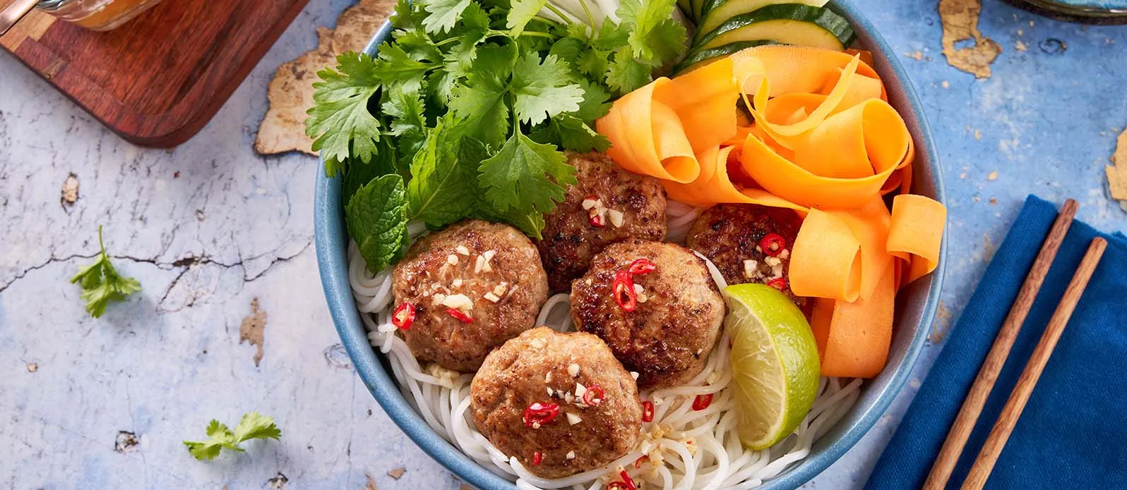 Aromatické vepřové masové kuličky marinované v marinádě Kikkoman Teriyaki, podávané s čerstvou zeleninou a rýžovými nudlemi, přelité klasickou vietnamskou zálivkou – lehké, svěží jídlo z Hanoje v jednoduchém domácím stylu.