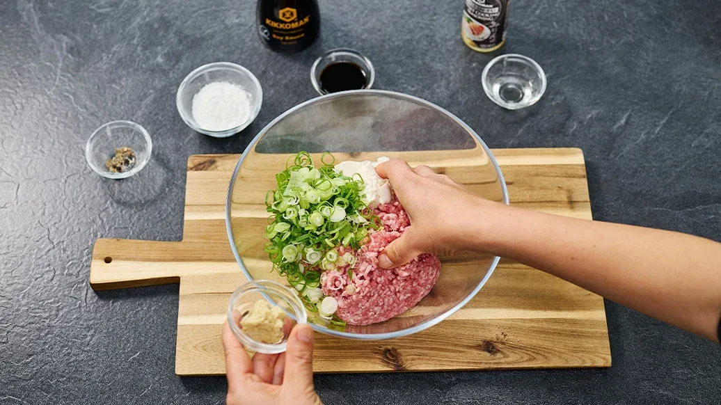 V míse smíchejte mleté maso, rozdrobené tofu, jemně nasekanou jarní cibulku, nastrouhaný zázvor, kukuřičný škrob, Kikkoman Sójovou omáčku, Kikkoman Mirin sladké dochucovadlo a černý pepř. Důkladně promíchejte. Ze směsi vytvarujte malé kuličky a rozložte je na tác.