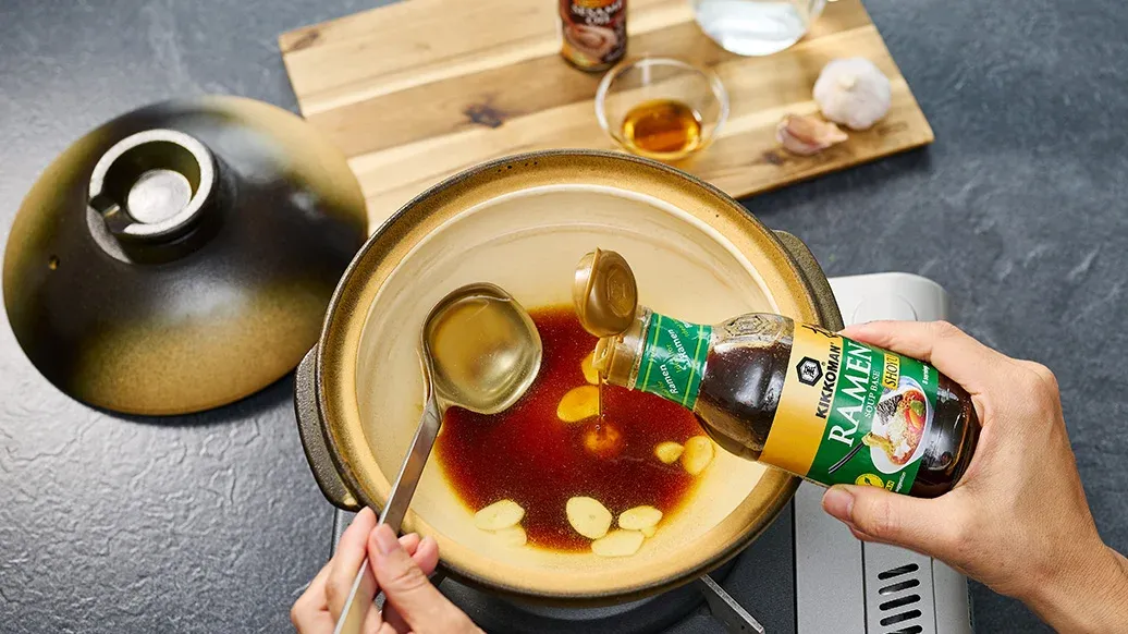 Do hrnce nalijte vodu, přidejte Kikkoman Základ na ramen, Kikkoman Sezamový olej a plátky česneku.