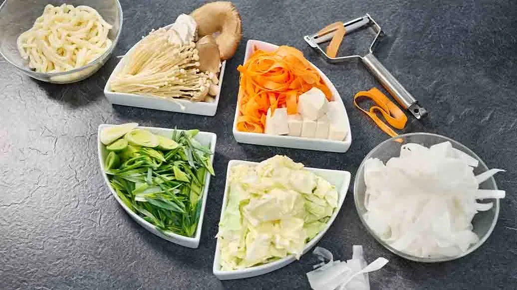 Zelí nakrájejte na menší kousky. Pórek nakrájejte na šikmé plátky. U hub podle potřeby odstraňte nožičky. Pomocí škrabky nakrájejte daikon a mrkev na tenké proužky. Tofu pokrájejte na 8 kusů.