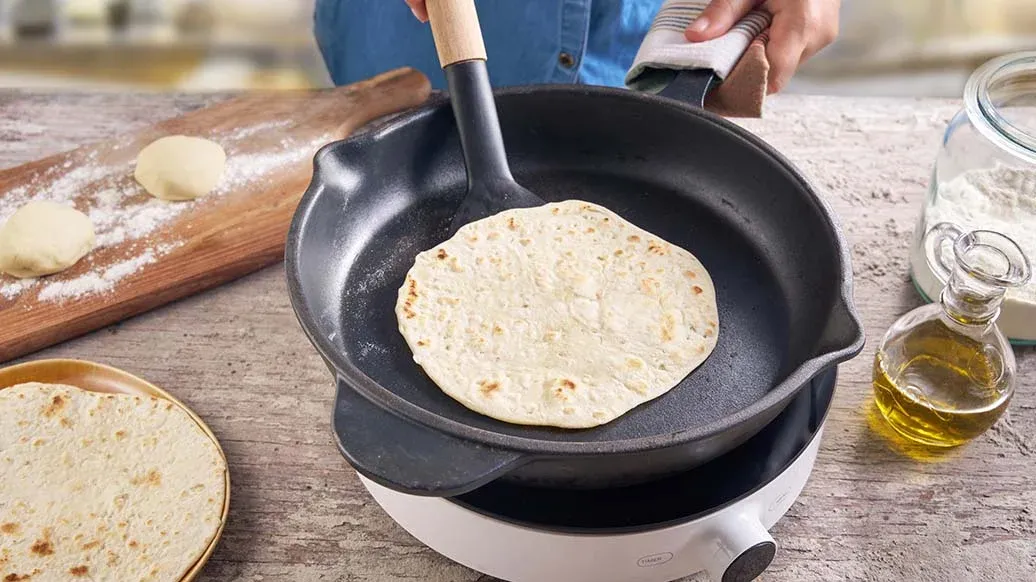 Smíchejte česnek s olivovým olejem. Postupně přidávejte teplou vodu k 150 g mouky, poté přidejte česnekový olej. Těsto hněťte asi 5 minut, dokud nebude hladké a pružné. Nechte odpočívat 20 minut v míse zakryté vlhkou utěrkou nebo potravinovou fólií. Rozdělte na 4 části, vytvarujte kuličky a vyválejte na tenké placky, podsypávejte zbylou moukou (20 g). Rozpalte suchou pánev na středně vysokou teplotu a každé čapátí opékejte 20–30 sekund z každé strany, dokud se nevytvoří zlaté bublinky a tmavé skvrny.