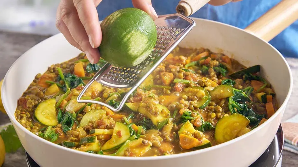 Aromatický mung dál se špenátem a mrkví, dochucený citronem, limetkovou kůrou a sójovou omáčkou Kikkoman se sníženým obsahem soli. Lehký a krémový, provoněný čerstvým koriandrem.