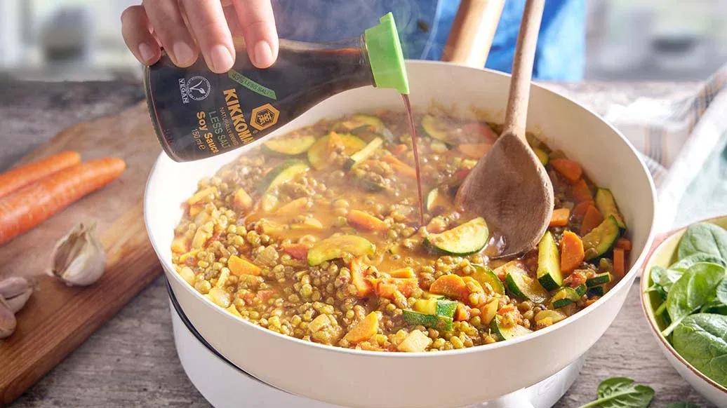Mung fazole vařte v zeleninovém vývaru 35–40 minut. Mrkev a cuketu nakrájejte na plátky. Na ghí restujte cibuli, česnek, mrkev a cuketu po dobu 3–4 minuty. Přidejte kmín, kurkumu, skořici a chilli a krátce osmahněte (10–15 sekund), aby se rozvinulo aroma koření. Vmíchejte uvařené fazole, poté přidejte konzervovaná rajčata a dochuťte sójovou omáčkou Kikkoman se sníženým obsahem soli. Nechte 5 minut mírně probublávat, poté přidejte špenát a vařte ještě 1 minutu.