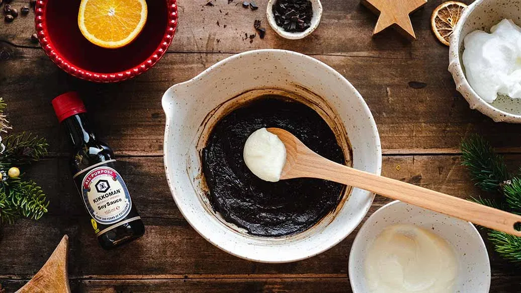 Ve středně velké misce smíchejte rozpuštěnou hořkou čokoládu, espresso a Sójovou omáčku Kikkoman. Míchejte, dokud nevznikne hladká směs.