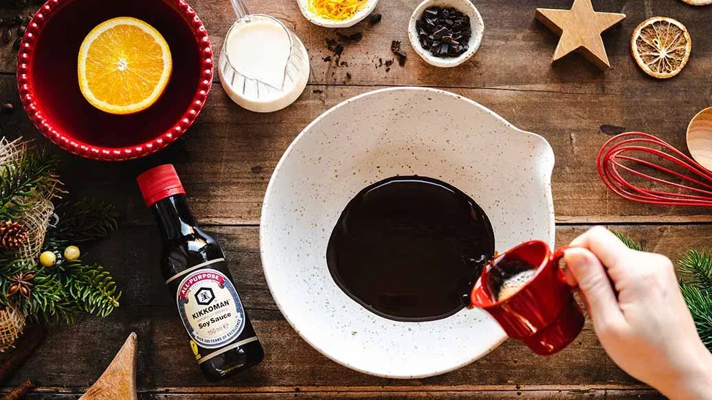 60 g hořké čokolády (85 % kakaa), rozpuštěné – 30 ml espressa – 1 čajová lžička Kikkoman Sójová omáčka přirozeně fermentovaná tekuté ochucovadlo