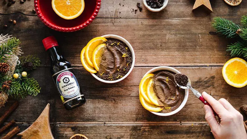 Nadýchaná pěna z hořké čokolády a espressa, zjemněná kapkou Sójové omáčky Kikkoman pro jemný slaný nádech. Dochucená pomerančovou kůrou, skořicí a strouhanou čokoládou. Hříšně požitkářské, a přesto elegantní finále každého svátečního menu.