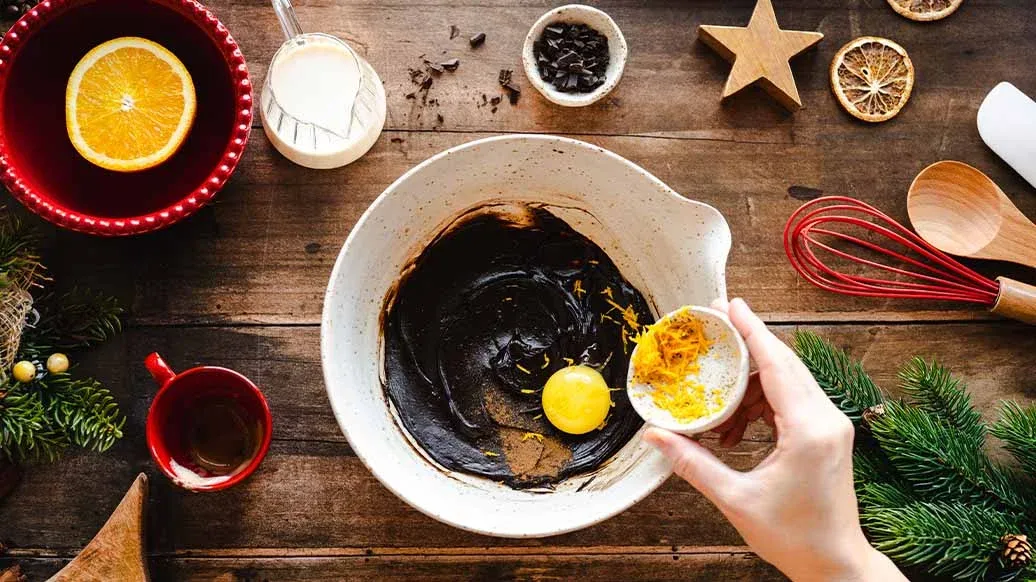 Do čokoládové směsi přidejte žloutek, skořici a nastrouhanou kůru z poloviny pomeranče. Míchejte, dokud se vše dobře nespojí, a poté směs odložte stranou.