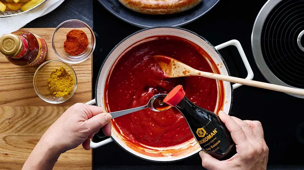 Oblíbená klasika německého street foodu v netradičním podání: Kikkoman Sójová omáčka a směs koření tvoří výraznou curry omáčku. Doplněná krémovou majonézou s Kikkoman Ponzu citrón a pikantní Kikkoman Kimchi chili omáčkou – ideální na namáčení křupavých hranolků.
