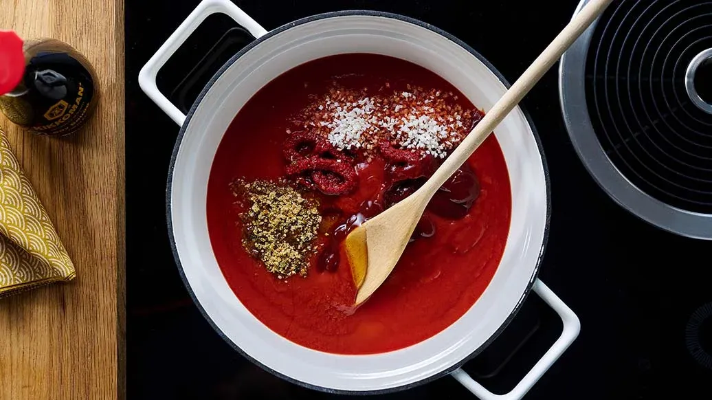 500 g pasírovaných rajčat (z konzervy) – 2 polévkové lžíce rajčatového protlaku – 3 polévkové lžíce kečupu – 2 čajové lžičky medu (nebo javorového sirupu, případně Kikkoman Sladkého mirin dochucovadla) – 1 čajová lžička zeleninového bujonu – 2 čajové lžičky sušené cibule (nebo 1 malá cibule, nakrájená nadrobno)