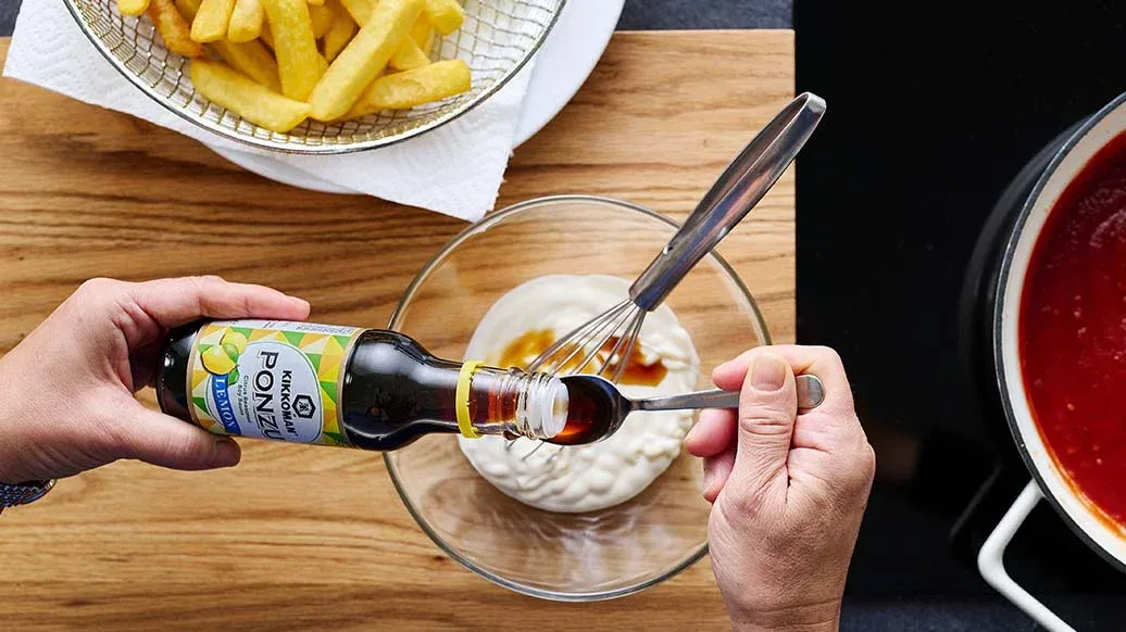 Hranolky připravte podle návodu na obalu. Mezitím smíchejte majonézu s Kikkoman Ponzu citrónovou sójovou omáčkou.