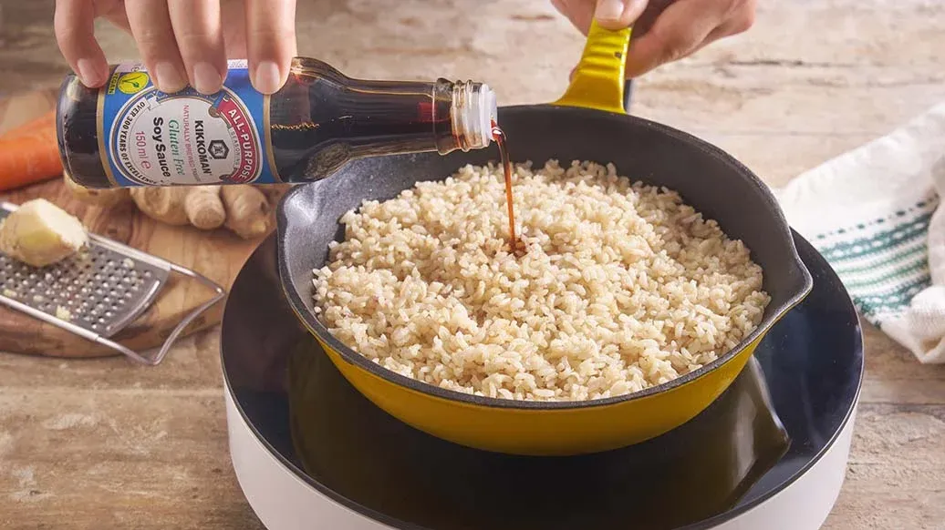 Rýži uvařte podle návodu na obalu. V pánvi rozehřejte ghí a opékejte šalotku a česnek 1 minutu. Přidejte rýži a restujte další 2 minuty. Ochuťte bezlepkovou sójovou omáčkou Kikkoman. Ozdobte dál plátky chili papričky a podávejte s rýží.