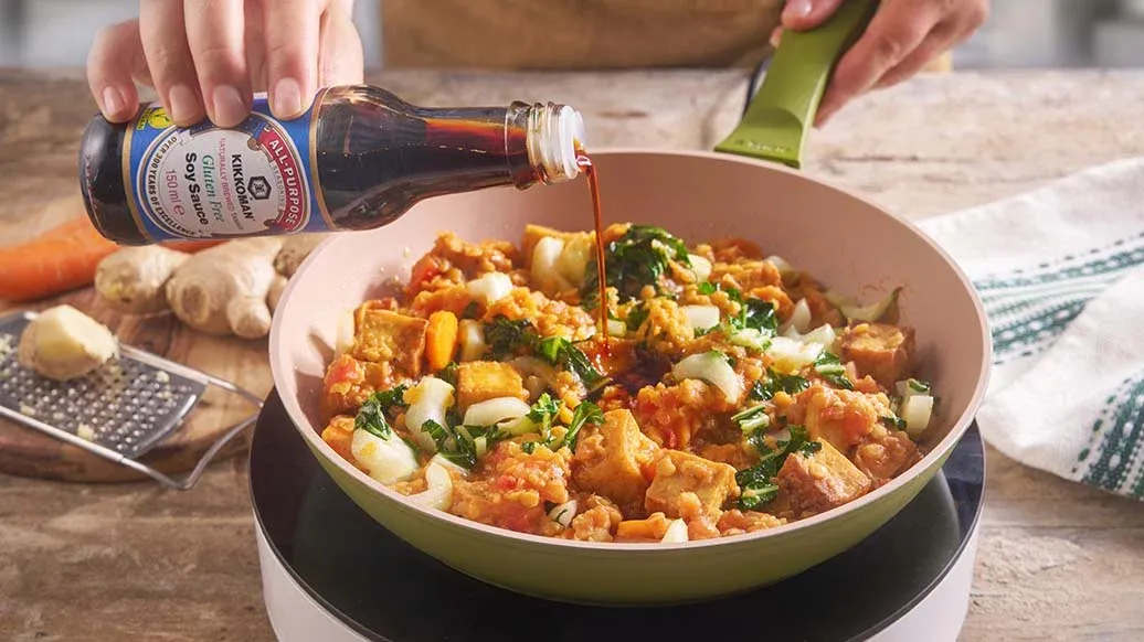 Krémový dál z červené čočky se zázvorem a křupavým tofu, dochucený masalou a bezlepkovou sójovou omáčkou Kikkoman. Podávejte s voňavou smaženou rýží s česnekem a šalotkou.