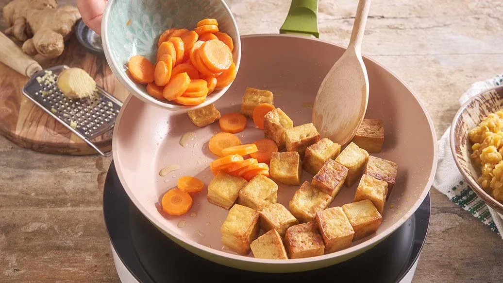 Čočku vařte v zeleninovém vývaru 10 minut. Na pánvi opečte tofu na ghí asi 4–5 minut dozlatova a dokřupava. Přidejte mrkev a zázvor a restujte ještě 2 minuty.