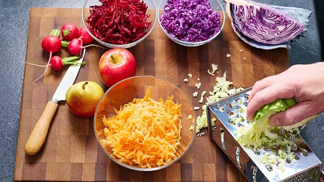 100 g špičatého zelí – 160 g červeného zelí – 120 g čerstvé červené řepy – 2 mrkve – 50 g ředkviček – 1 malé jablko s červenou slupkou – 1 malá hruška s červenou slupkou