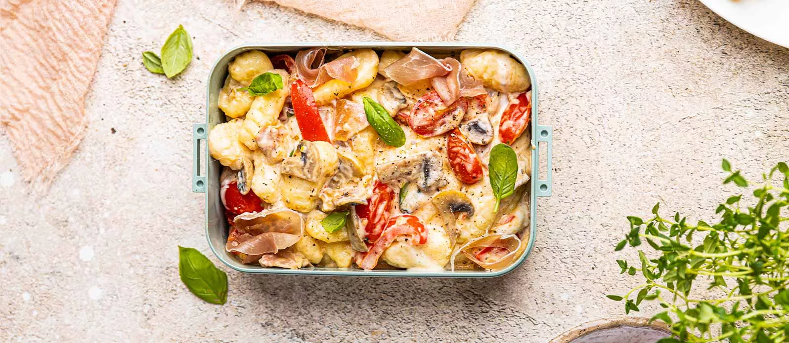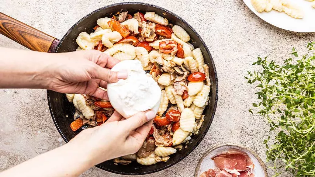 Vyzkoušejte lahodné domácí gnocchi v sametově krémové omáčce z rozpuštěné burraty, doplněné houbami, italskou šunkou, cherry rajčaty a čerstvou bazalkou – dokonalá kombinace chutí pro chvíle pohody.