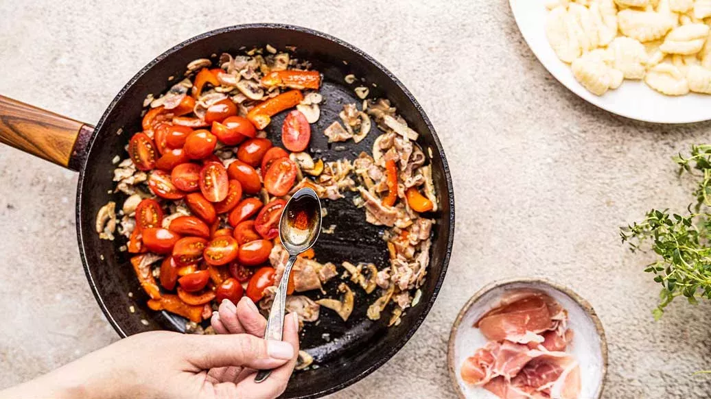 Gnocchi s prosciuttem, paprikou, žampiony a cherry rajčátky s burratou
