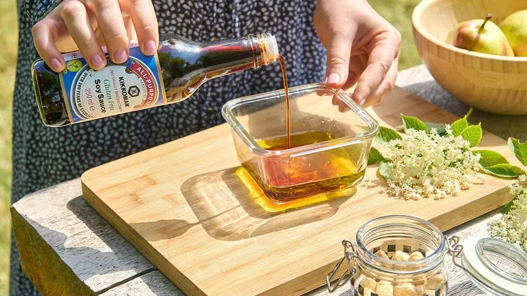 V malé misce vyšlehejte bezový sirup, extra panenský olivový olej, bílý vinný ocet a Kikkoman Tamari omáčku. Dochuťte čerstvě mletým černým pepřem.