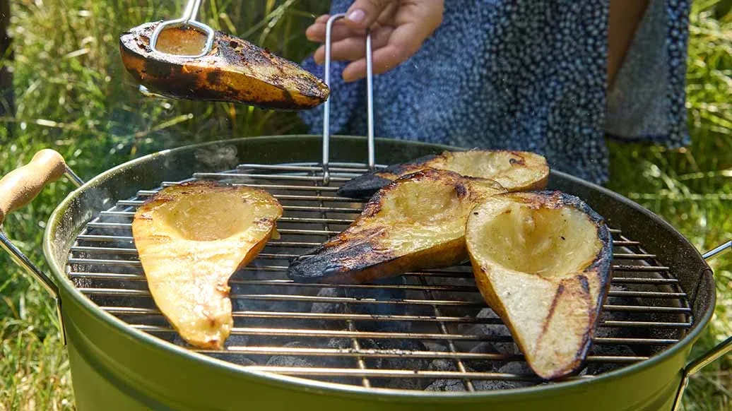 Předehřejte gril na vysokou teplotu. Půlky hrušek lehce potřete olivovým olejem. Položte je na gril řeznou stranou dolů a grilujte 3–4 minuty, dokud se neobjeví grilovací pruhy a hrušky lehce nezměknou. Otočte je a grilujte další 2–3 minuty.