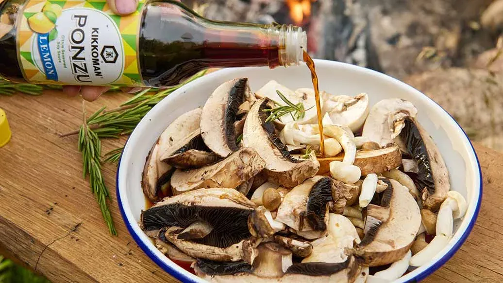 Tyto houbovo-pórkové špízy, , dochucené rozmarýnem, česnekem a Kikkoman Ponzu Citrón omáčkou, jsou jednoduchým, ale neodolatelně chutným jídlem – perfektní volba pro grilování nebo rychlou večeři.