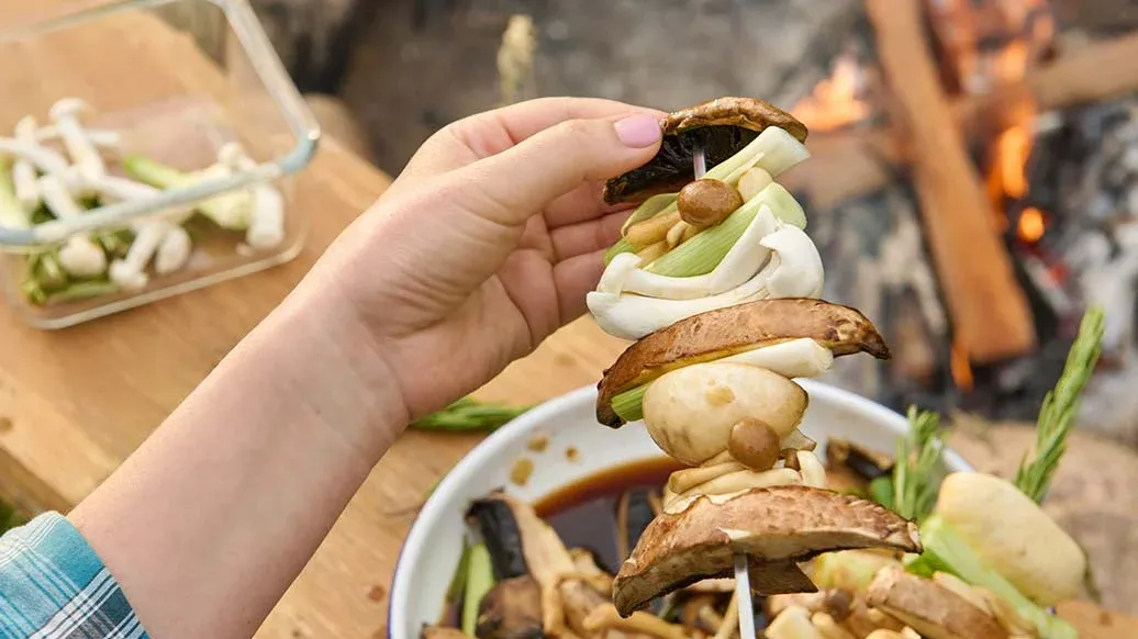Na špejle nebo kovové jehly střídavě napichujte houby a pórek. Zbylou marinádu si nechte na později.