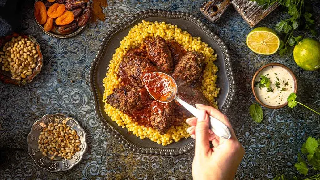 Voňavá hovězí kofta ochucená skořicí, římským kmínem a čerstvými bylinkami, dušená v pikantní rajčatové omáčce s limetkou. Podává se s kuskusem, jogurtem a piniovými oříšky. Hřejivé jídlo s výrazným charakterem středního východu.
