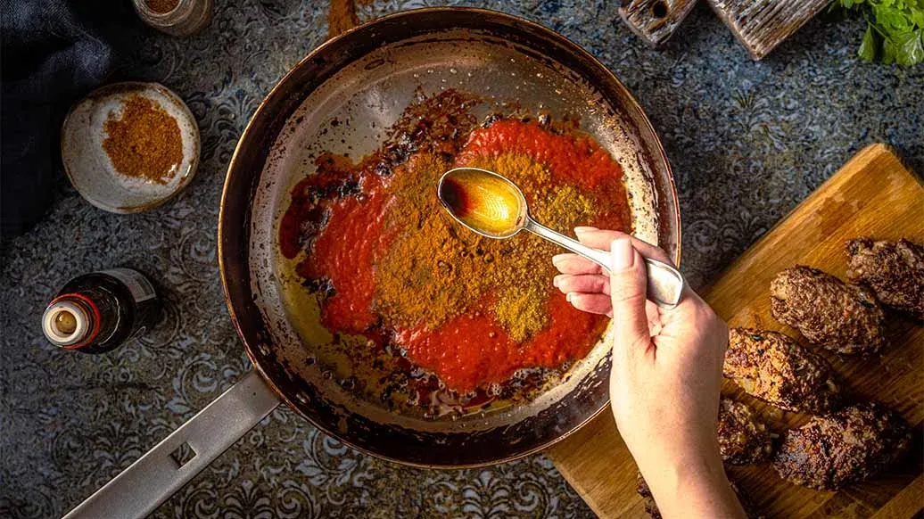 Z pánve vyjměte opečené placičky. Do výpeku přidejte pasírovaná rajčata. Vmíchejte skořici, římský kmín, čili a Sójovou omáčku Kikkoman. Přikryjte pokličkou a nechte mírně dusit asi 15 minut.