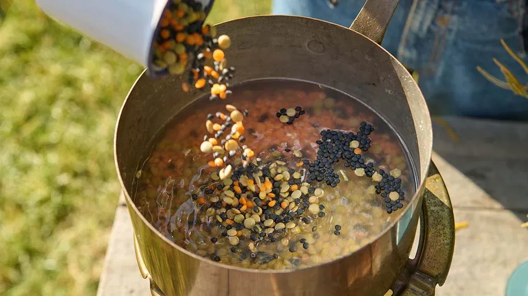 V hrnci smíchejte čočku s vývarem nebo vodou a přiveďte k varu na středním plameni. Poté snižte teplotu a nechte na mírném ohni vařit 20–25 minut, dokud čočka nezměkne. Občas promíchejte a podle potřeby přidejte více vody, aby se dosáhlo požadované konzistence.