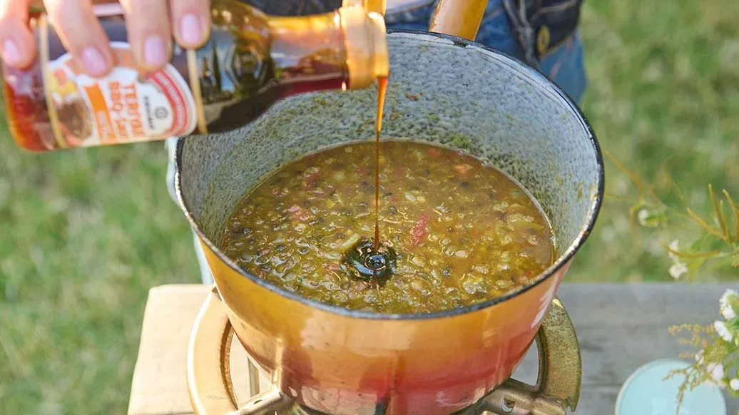 Poté přidejte uvařenou čočku i s trochou zbylé tekutiny a důkladně ji promíchejte s kořeněnou směsí. Dochuťte Kikkoman Teriyaki BBQ omáčkou s medem a Kikkoman Sójovou omáčkou. Nechte na mírném ohni povařit 5–10 minut, aby se chutě dokonale propojily a vznikla lahodná, aromatická omáčka.