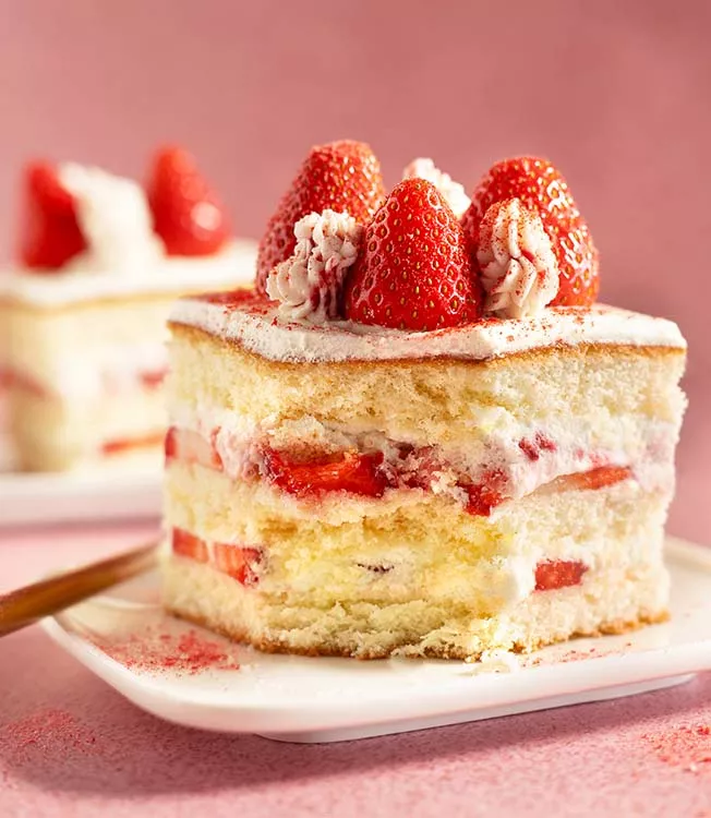 Na první vrstvu piškotového korpusu rovnoměrně rozložte polovinu plátků jahod a navrch naneste přibližně ¼ krémové směsi. Opatrně ji rozetřete dohladka. Poté přidejte druhou vrstvu korpusu, na ni zbytek jahod a další ¼ krému. Opět rovnoměrně rozetřete a nakonec přiklopte poslední vrstvou piškotu.