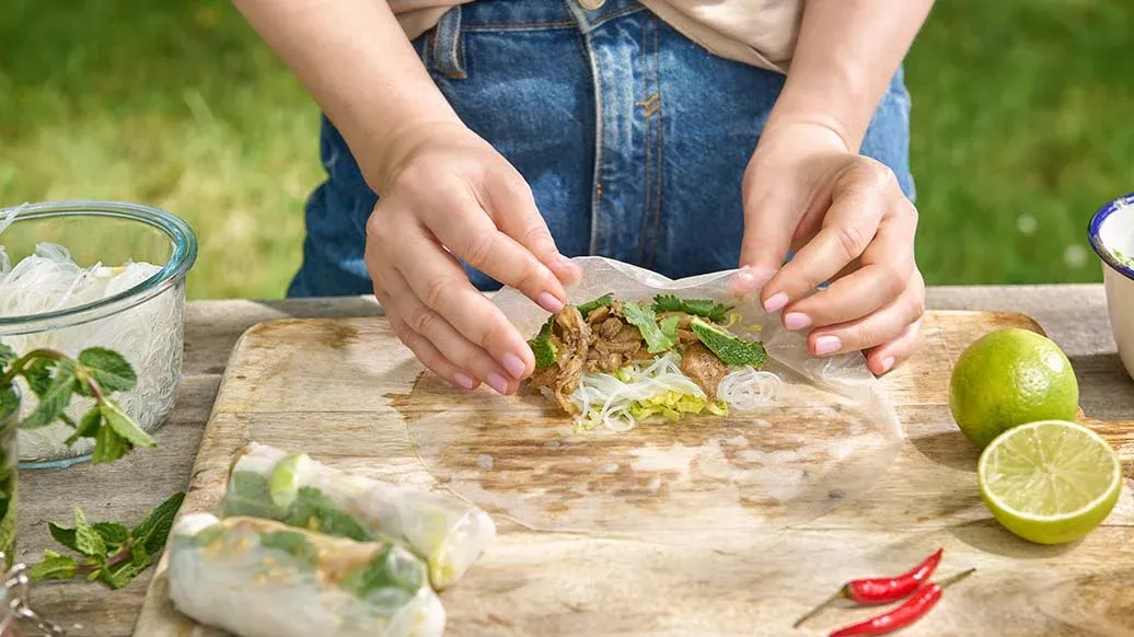 Strany obalu přehněte přes náplň a poté pevně srolujte odspodu, aby byla náplň zcela uzavřená. Postup opakujte se zbývajícími přísadami.