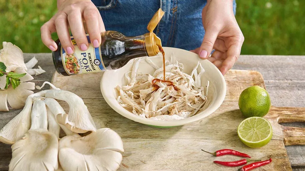 200 g hlívy královské, natrhané – 40 ml Kikkoman Poke omáčka – 1 g směsi koření pěti vůní – 1 polévková lžíce oleje na vaření