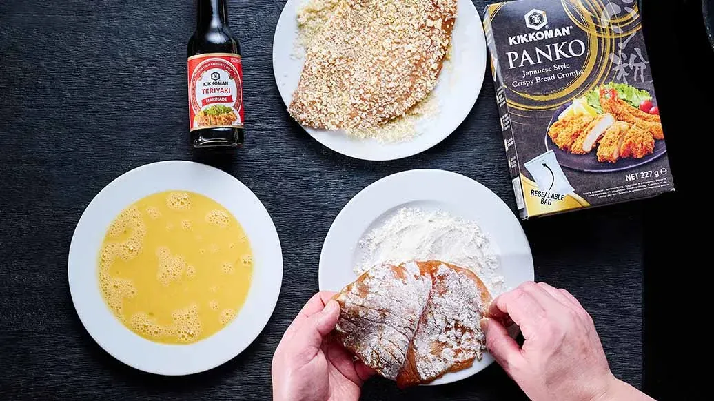 2 vepřové řízky (cca 130 g každý) – 100 ml Kikkoman Teriyaki marináda tekuté ochucovadlo – 40 g hladké mouky – 2 vejce – 50 g Kikkoman Panko – japonská křupavá strouhanka