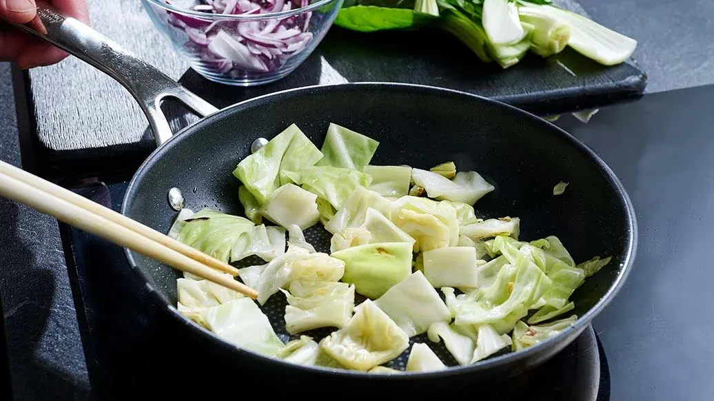 Zelí nakrájejte na malé kousky a osmažte na pánvi na 1 lžíci slunečnicového oleje na středním plameni. Jakmile je hotové, přidejte 1 lžičku Kikkoman Sójové omáčky, krátce promíchejte a odstavte. Cibuli nakrájejte na proužky, osmahněte na ½ lžíci rozehřátého oleje a ochuťte 2 lžičkami Kikkoman Sójové omáčky. Pak choi nakrájejte na široké proužky, osmahněte stejným způsobem na ½ lžíci oleje a přidejte 1 lžičku Kikkoman Sójové omáčky.