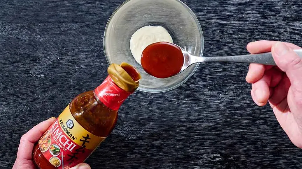 2 polévkové lžíce Kikkoman Kimchi pikantní chili omáčka – 2 polévkové lžíce majonézy – Pár lístků hladkolisté petržele