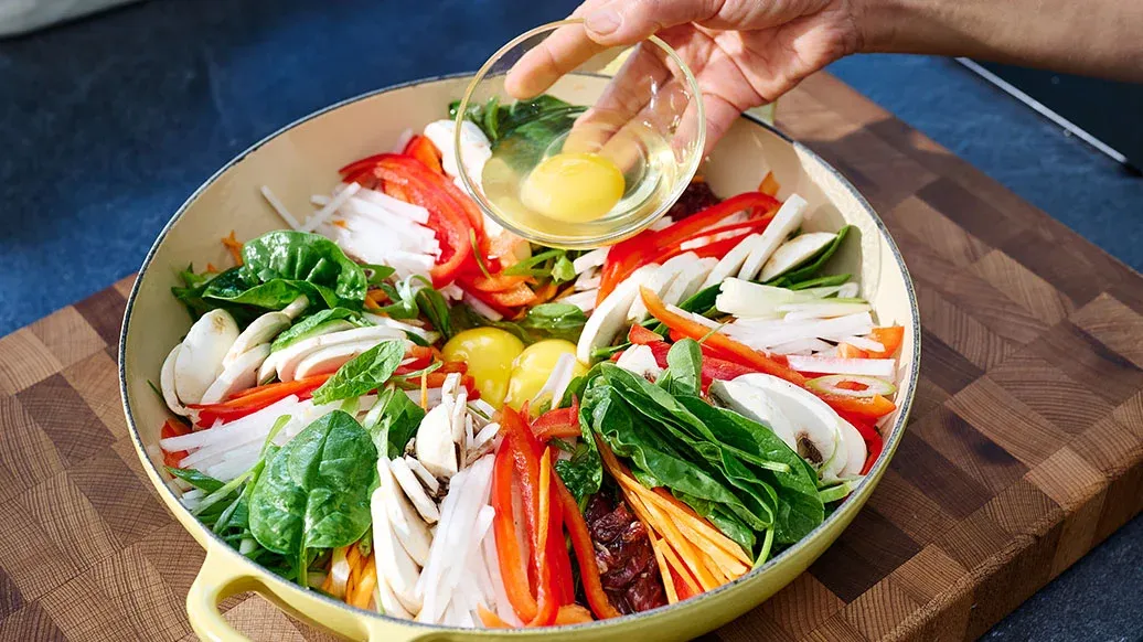 Rozklepněte vejce doprostřed hrnce. Hrnec postavte na střední plamen a rovnoměrně kolem ingrediencí nalijte vodu. Jakmile se vejce a zelenina dovaří, vše jemně promíchejte a podávejte.