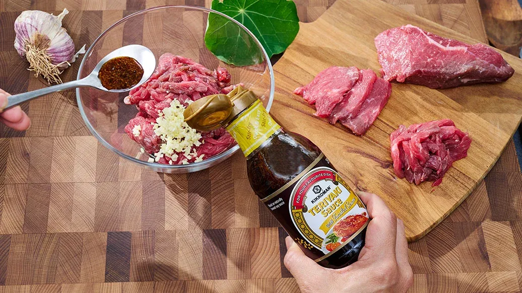 300 g tenkých plátků hovězího nebo vepřového masa (případně mletého hovězího nebo tofu) – 1 stroužek česneku, nastrouhaný – 120 ml Kikkoman Teriyaki Wok omáčka s praženým sezamem