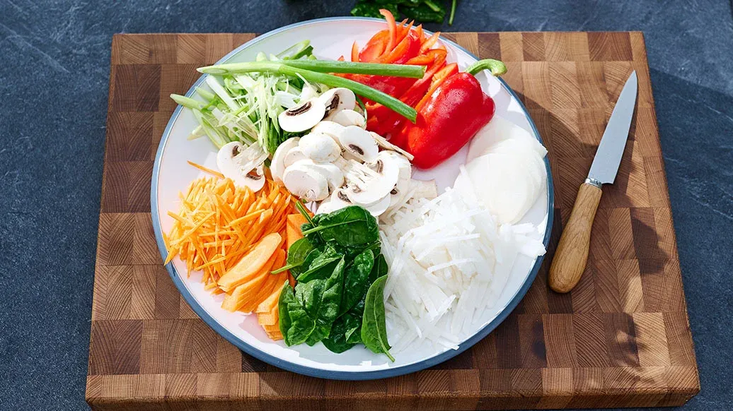 Ředkev daikon a mrkev nakrájejte na tenké proužky dlouhé asi 6 cm. Jarní cibulku, špenát a červenou papriku nakrájejte na kousky přibližně stejné délky. Houby nakrájejte na plátky silné asi 5 mm.