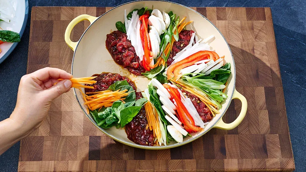 V hrnci rozehřejte Kikkoman Sezamový olej. Marinované maso rozdělte na pět porcí a rozložte je do kruhu, mezi jednotlivými porcemi nechte mezery. Do těchto mezer rovnoměrně rozložte zeleninu, aby vznikl kruhový vzor kde se střídají maso a zelenina.