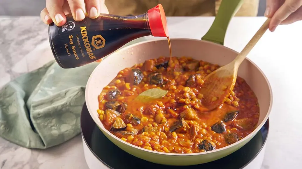 Přidejte rajčatovou passatu k zelenině z kroku 1, ochuťte sójovou omáčkou Kikkoman a vařte 5 minut.
