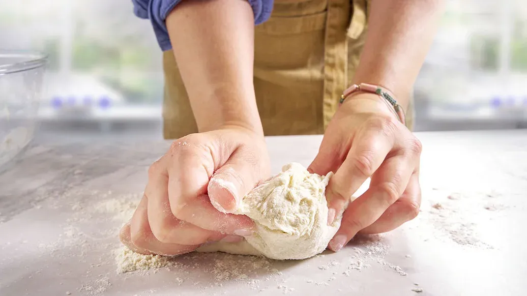 200 g pšeničné mouky – 20 g mouky na podsypání – ½ čajové lžičky prášku do pečiva – ½ čajové lžičky jedlé sody – 40 ml vlažného mléka – 75 g bílého jogurtu