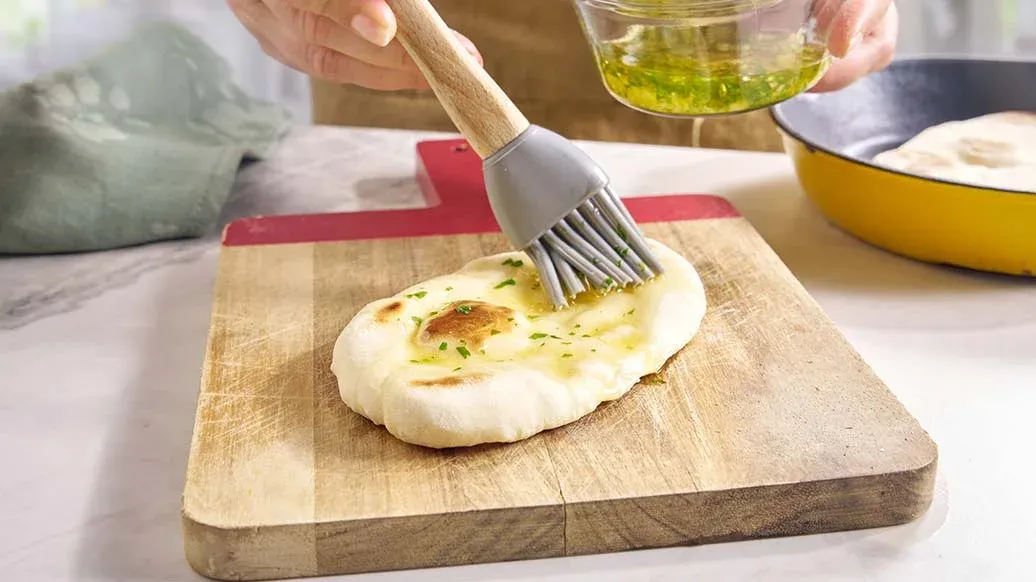Ve velké míse smíchejte 200 g mouky s práškem do pečiva a jedlou sodou. Postupně přidávejte vlažné mléko a míchejte, dokud nevznikne těsto, poté přidejte jogurt. Hněťte 5 minut, dokud nebude hladké a elastické. Přikryjte vlhkou utěrkou nebo potravinářskou fólií a nechte na teplém místě asi 20 minut odpočinout. Rozdělte na čtyři části a každou vyválejte na tenký oválný plochý chléb o tloušťce 3–4 mm, podsypávejte zbylou moukou.
