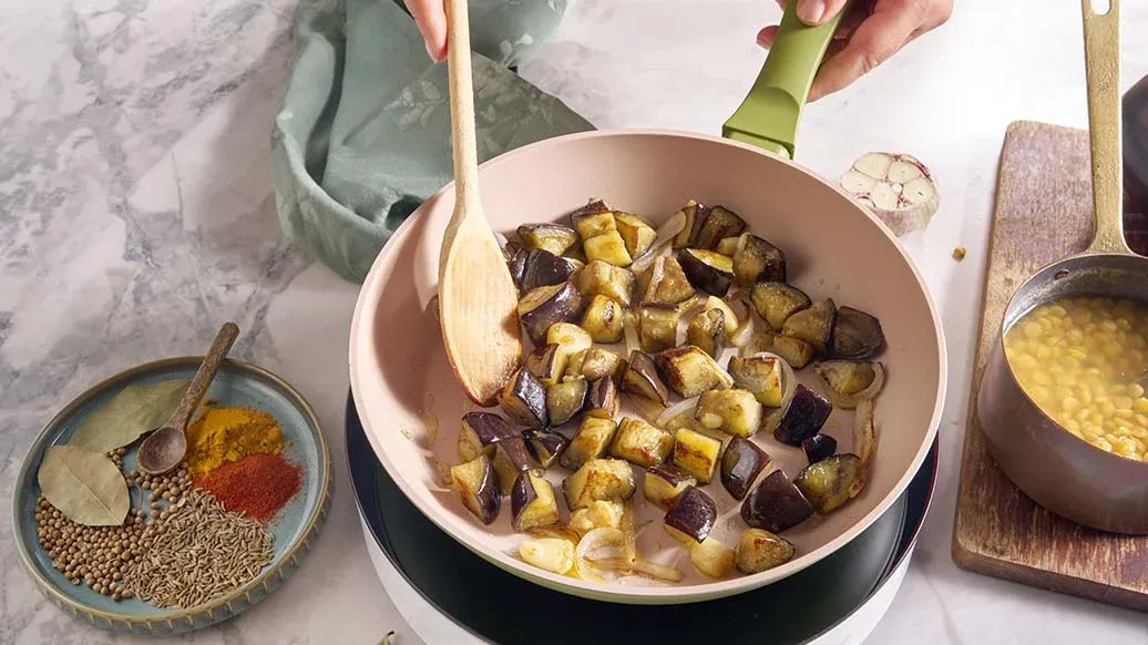 Odřízněte vršek hlavy česneku, aby se odkryly stroužky. Potřete olejem a pečte v troubě asi 30 minut (180°C). Cizrnu vařte v zeleninovém vývaru 40 minut. Na pánvi osmahněte cibuli a lilek na ghí 5 minut dozlatova, poté vymačkejte pečený česnek. Přidejte římský kmín, kurkumu, koriandrová semínka, uzenou papriku a bobkový list a restujte 10–15 sekund, aby se uvolnila vůně.
