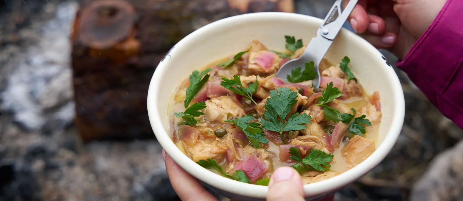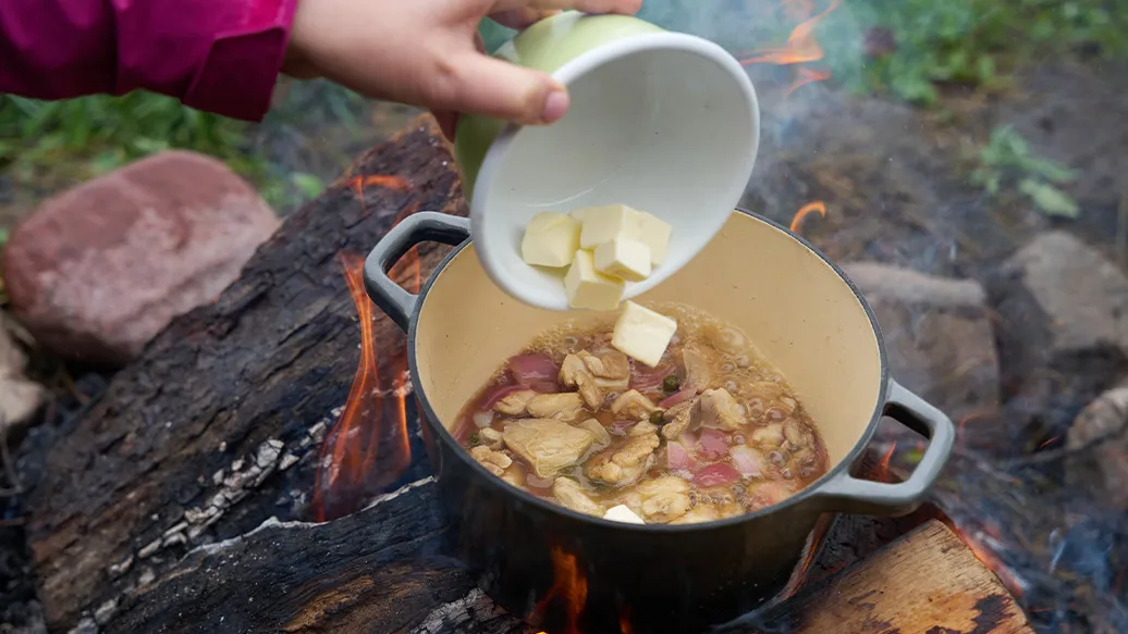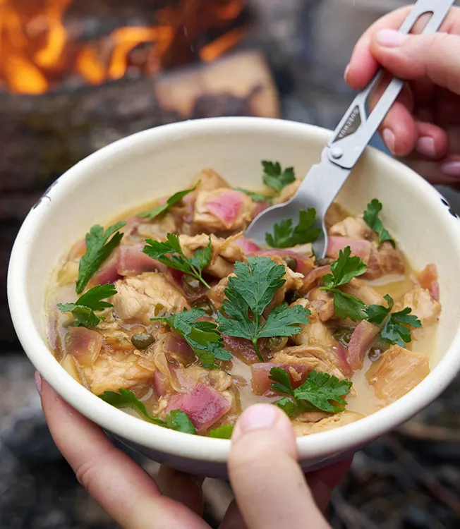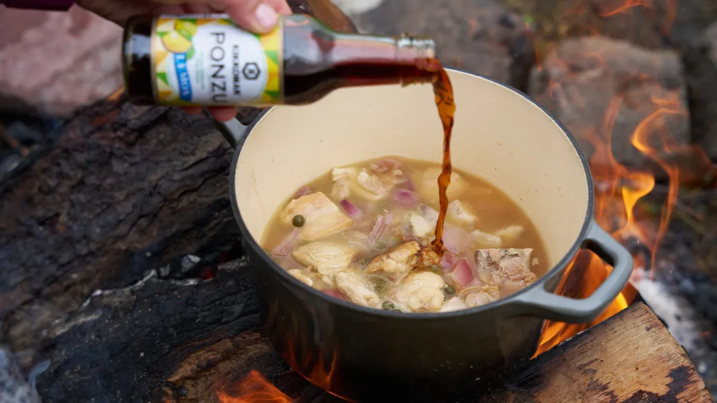 Šťavnaté kuře dušené v Kikkoman Ponzu Lemon s kapary dodává tomuto voňavému pokrmu citrusovou chuť — originální recept k vaření na volném ohni.