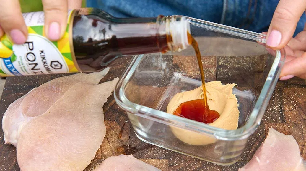 Kuřecí maso nakrájejte na středně velké plátky (asi 1,5 cm silné) a dochuťte pepřem. Smíchejte arašídové máslo s omáčkou Kikkoman Ponzu Citrón, abyste vytvořili marinádu, poté kuře důkladně potřete a nechte marinovat.