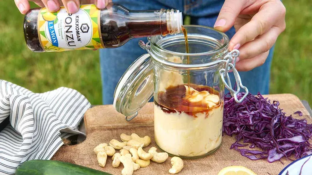 3 polévkové lžíce majonézy – 2 polévkové lžíce arašídového másla – 4 polévkové lžíce Kikkoman Citrónová ponzu omáčka – 1 polévková lžíce strouhané citronové kůry