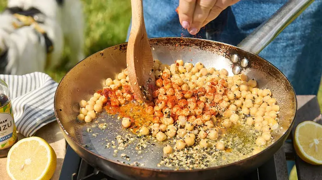 Cizrnu sceďte a osušte. Zalijte olivovým olejem a poté smíchejte s kořením a sezamovými semínky. Dochuťte solí a pepřem. Pečte v troubě na 200 ˚C po dobu 20 minut nebo osmažte na pánvi.