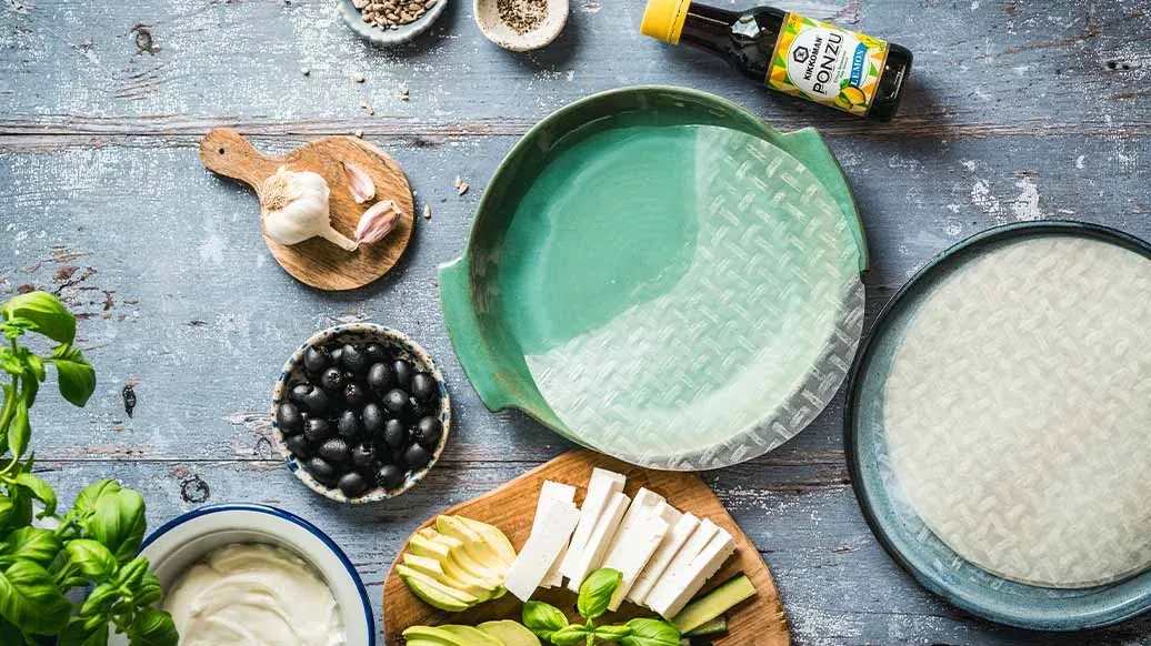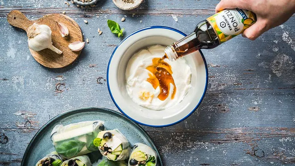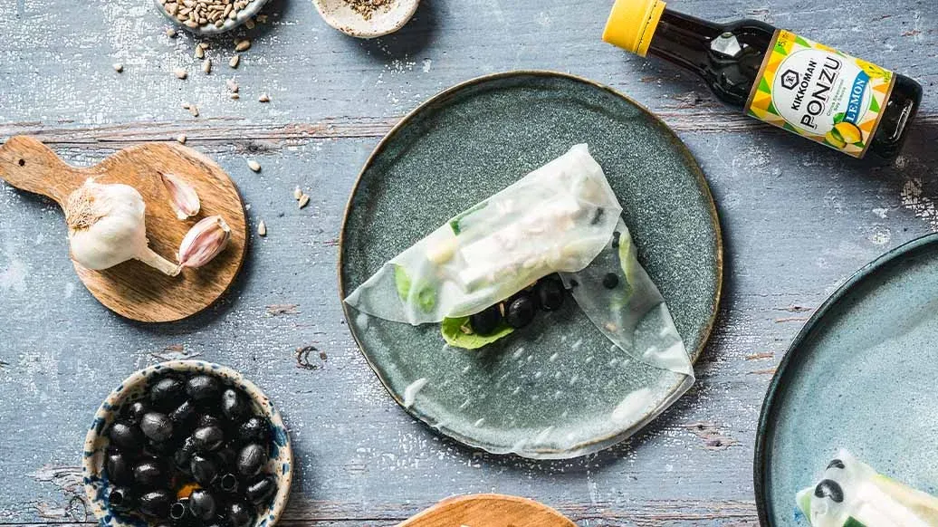 Lehké středomořské letní závitky plněné křupavou zeleninou, fetou a olivami – podávané s citrusovým řeckým jogurtovým dipem ochuceným Kikkoman Ponzu citron. Skvělé jako oběd nebo svěží, chuťově výrazná svačina.